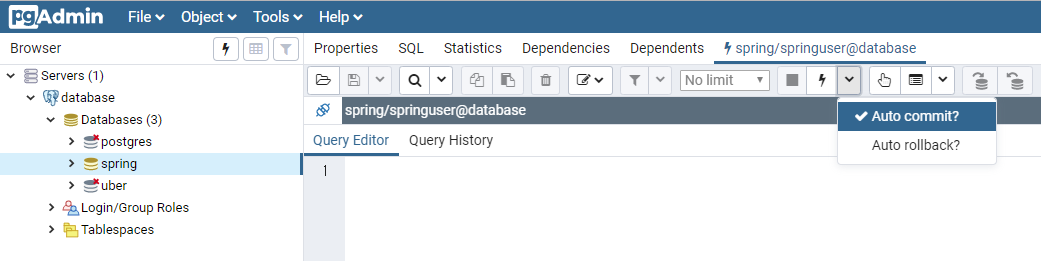 pgAdmin은 실행할 때 기본적으로 AutoCommit이 활성화되어 있습니다.